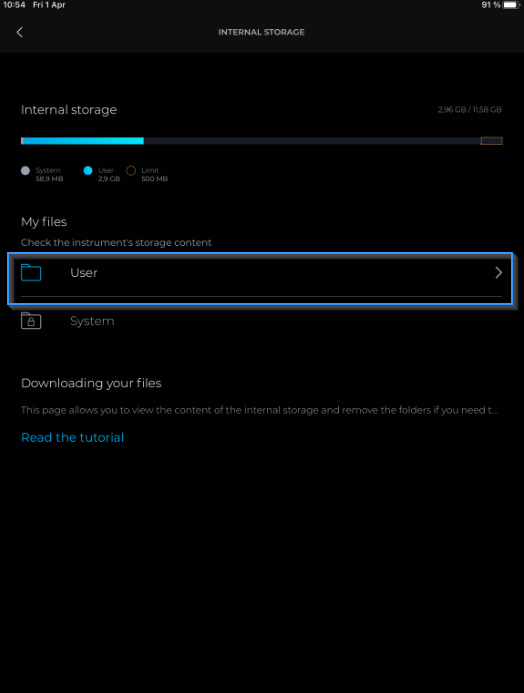 You can check the internal storage status either on your instrument page or by clicking on the "Storage" folder in the Singularity app.