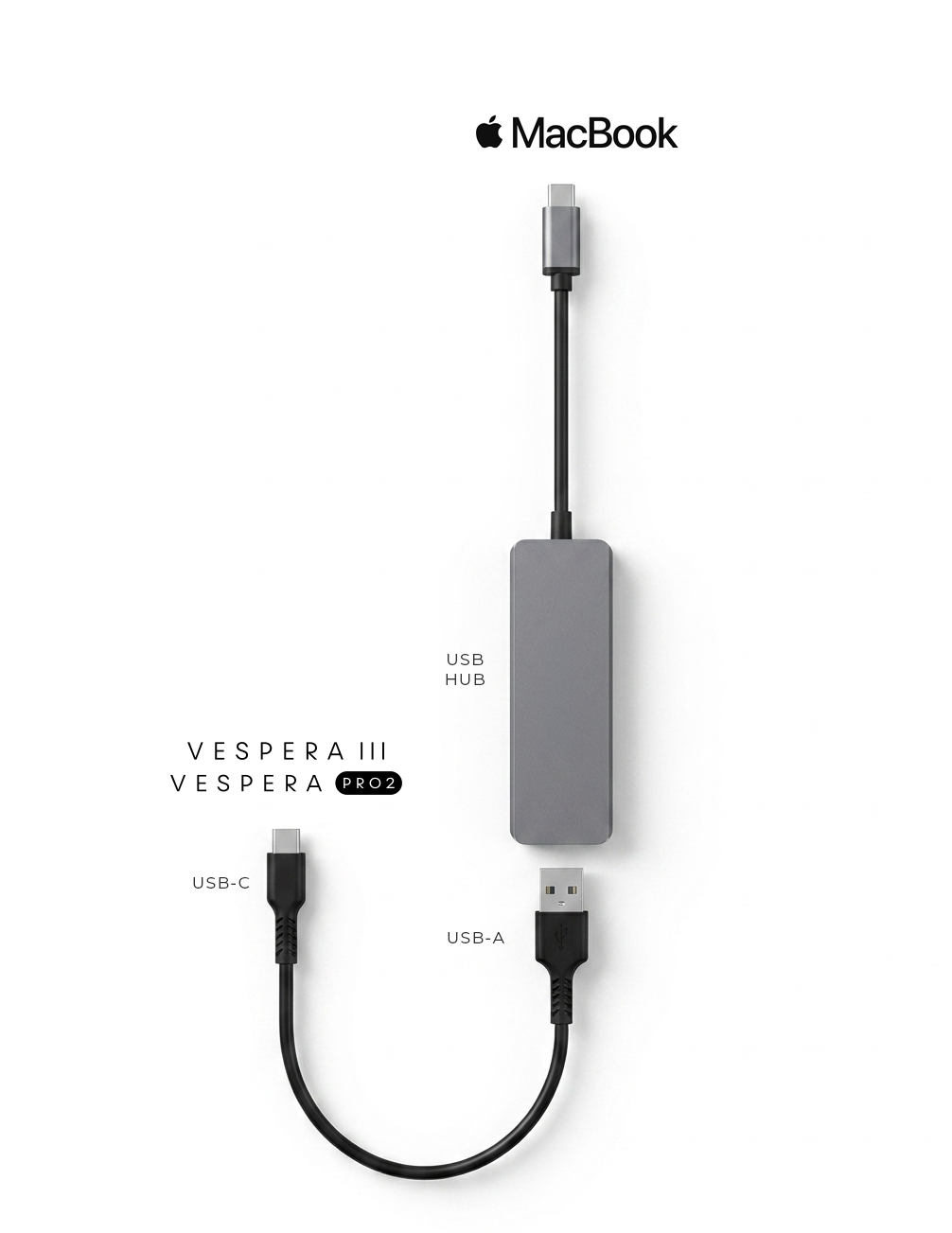 To establish a proper connection between your instrument and your Mac, please use a USB switch or adapter equipped with a USB-A port. This allows you to connect both USB-C ends — from the instrument and from your Mac — through the adapter.