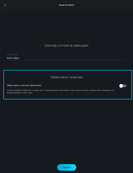 • Activez "Observations avancées" pour pouvoir ajouter une cible "Observation sur plusieurs nuits" à votre plan (vous devez être connecté à votre télescope intelligent).